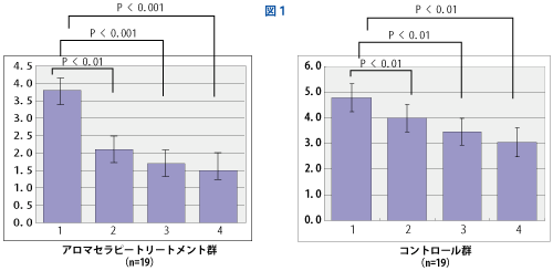 主観的な臨床症状の1つである疲労感については、図1に示すように1時間のアロマセラピートリートメントを受けた群は直後より統計学的に有意に症状が改善し、翌早朝も疲労感は軽減していた。一方、コントロール群も1時間の安静により有意に改善がみられたが、その改善はアロマセラピートリートメント群がコントロール群と比較してより大きく統計学的に有意なものであることが確認された(p<0.001、三元配置分散分析)。